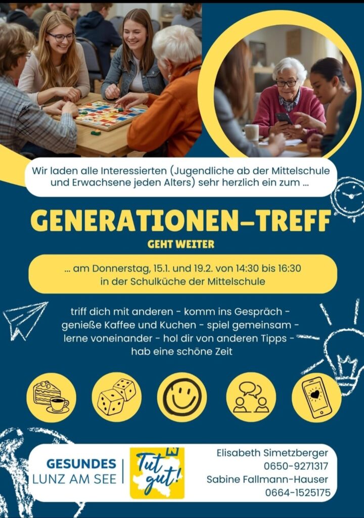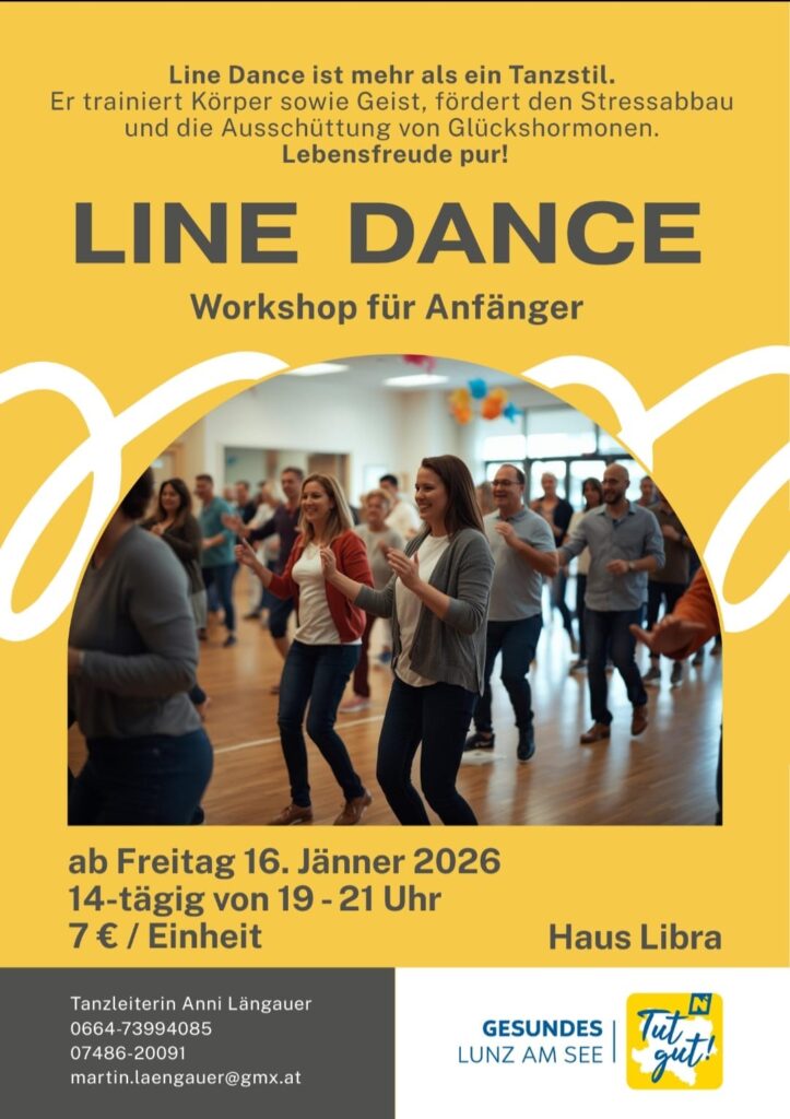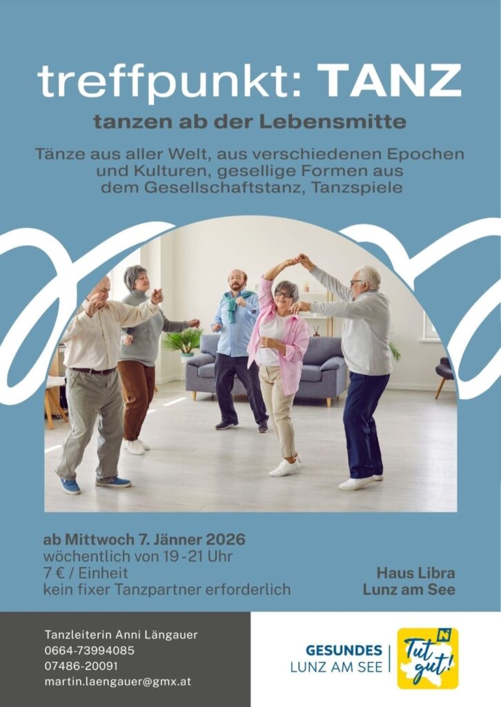 Zu Beginn des neuen Jahres 2026 🎉 gibt es wieder einige tolle Veranstaltungen im Rahmen der Gesunden Gemeinde 🏥 (Aktion: Tut gut!), vom Generationen-Treff 👵👴 über Line Dance (Anfänger 🕺 bzw. Geübte 💃) bis hin zum Treffpunkt: TANZ 💃🕺.