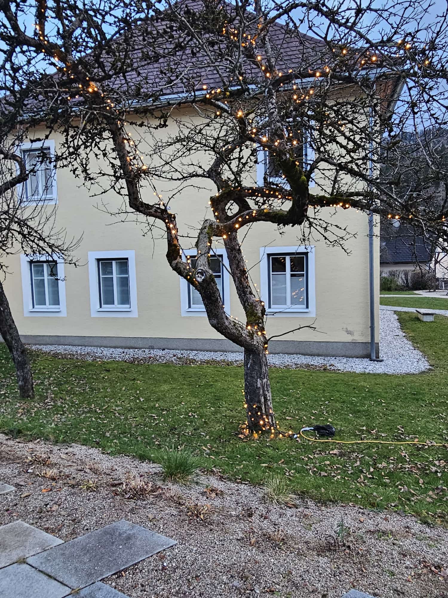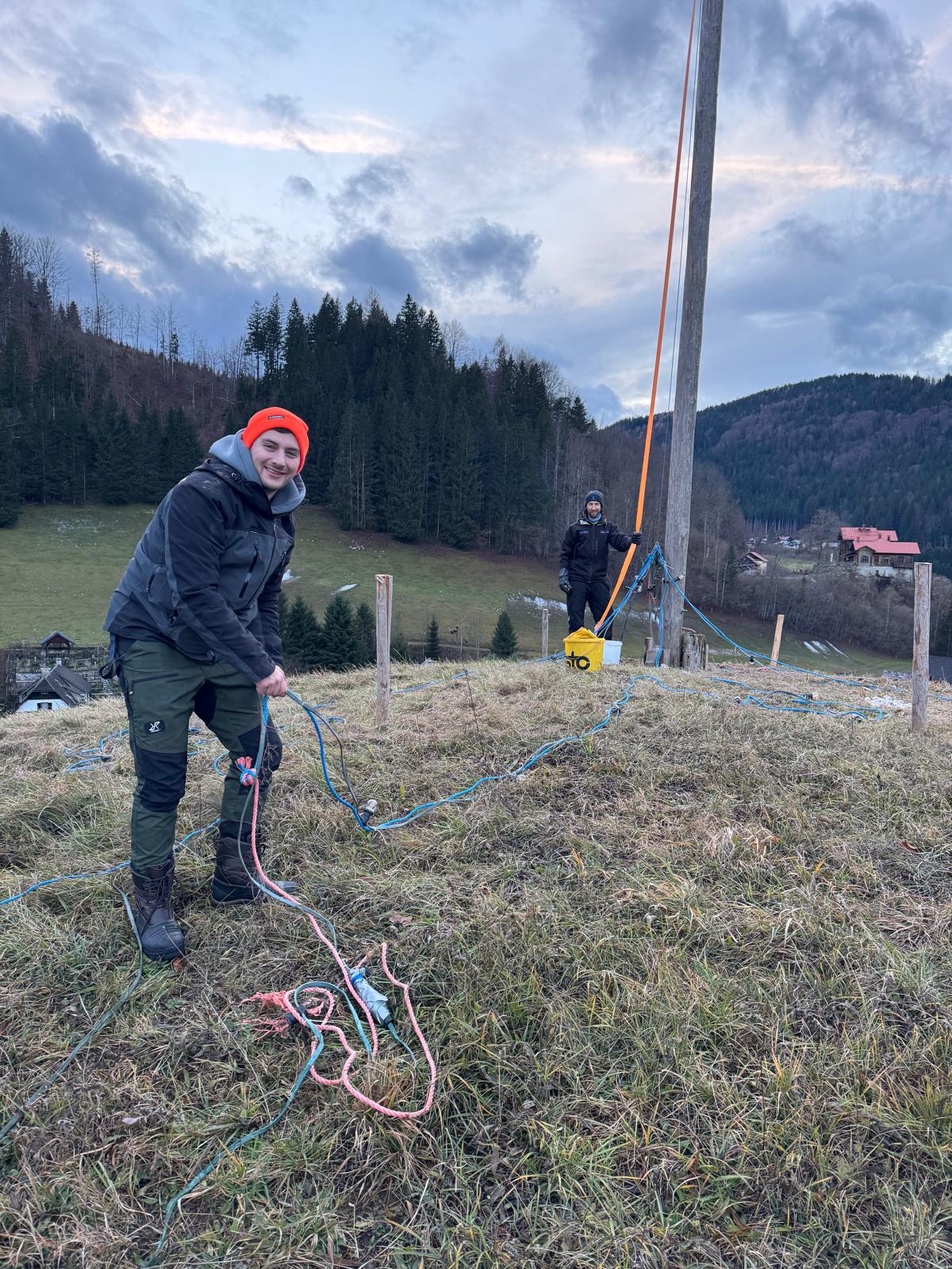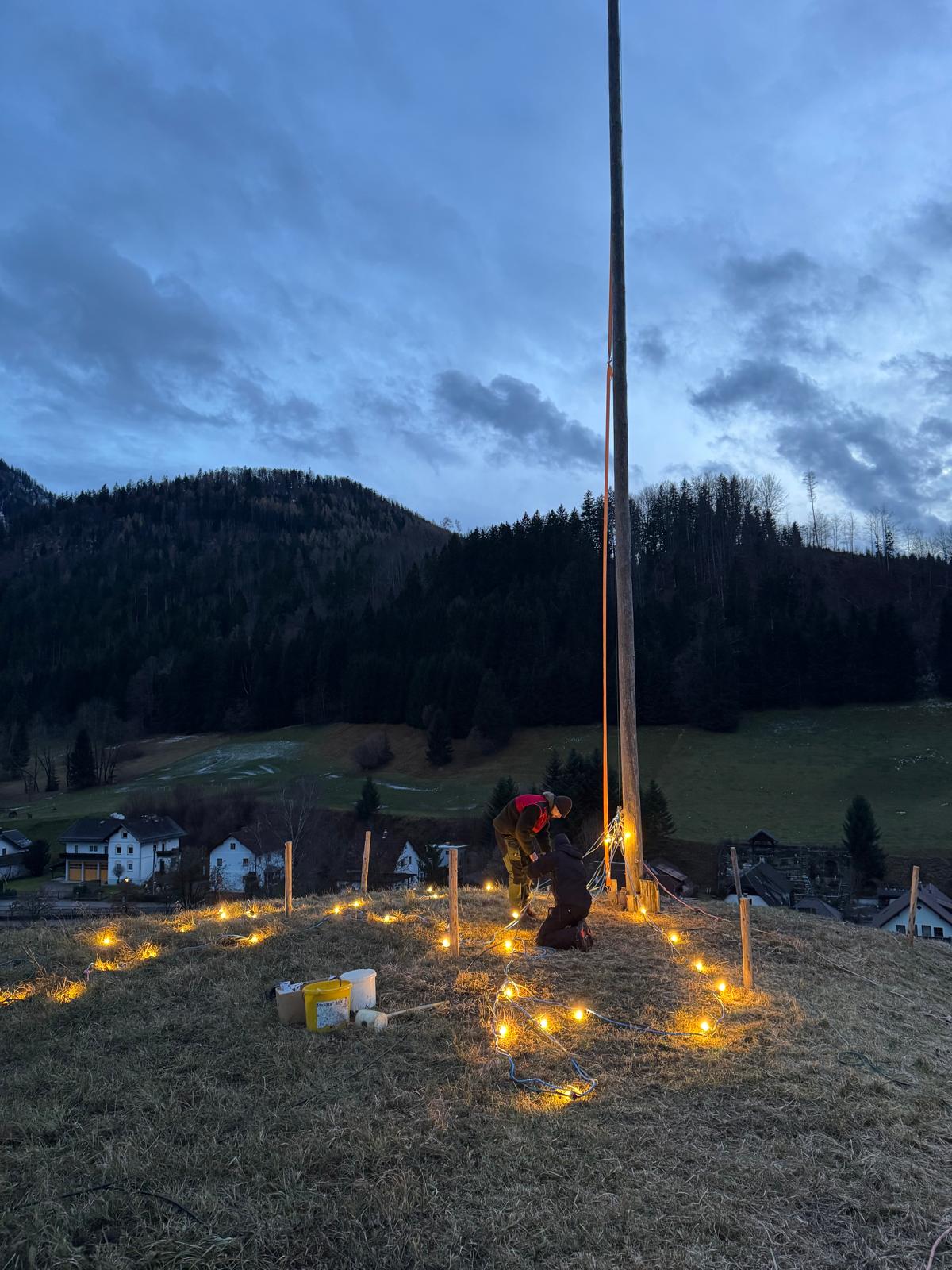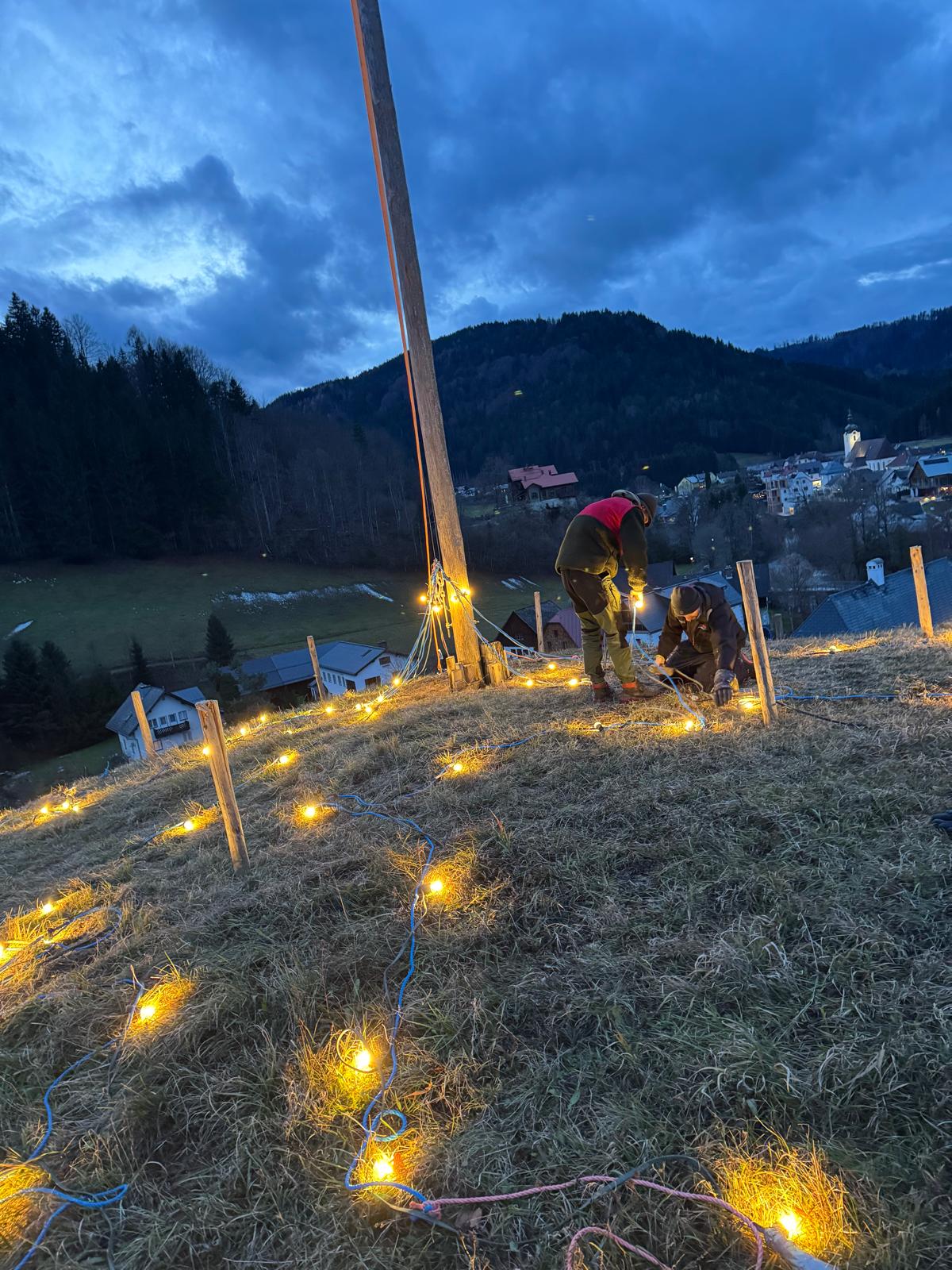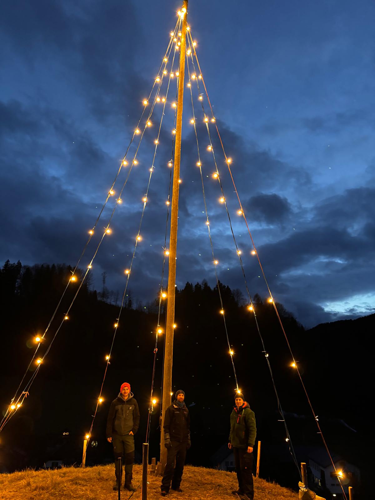 Bürgermeister Sepp Schachner, Vizebürgermeister Gerald Lechner und GGR Mike Mayr montierten am Zellwerwirtkogel den Christbaum aus Lichterketten. 🌟 Eine schöne Tradition, denn der leuchtende Baum ist im gesamten Ortsgebiet sichtbar und wird am Samstag zum Start der Dorfweihnacht erstmals erstrahlen. 🎇