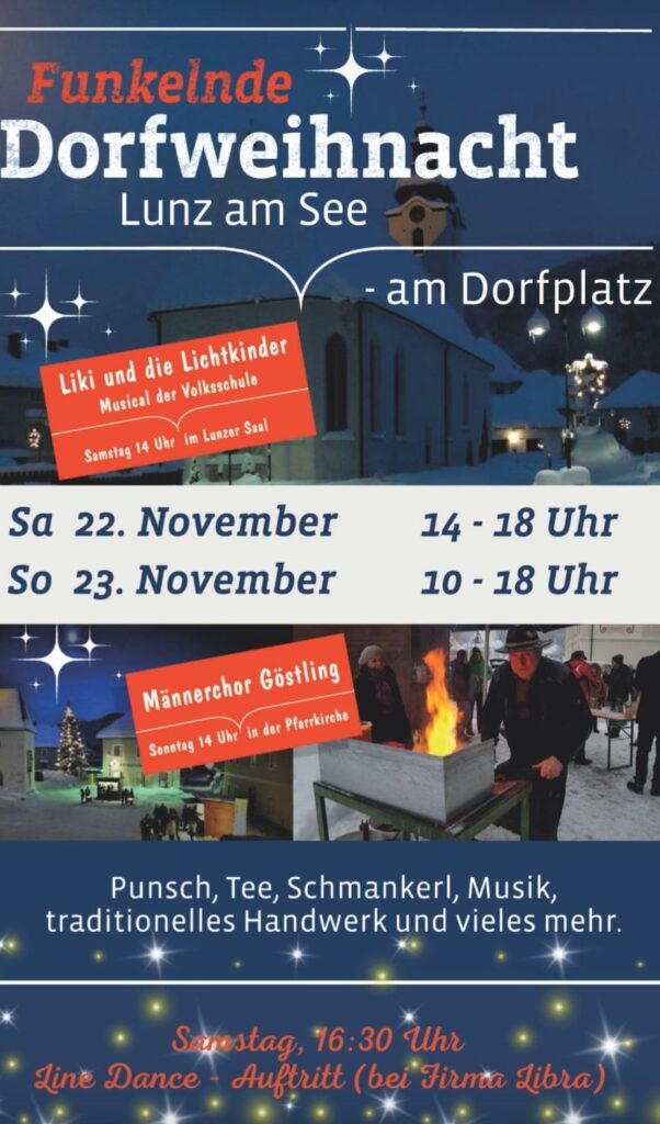 Für das Wochenende erwartet euch ein abwechslungsreiches Programm. Der Musikverein Lunz am See sorgt in der gesamten Begegnungszone für die vorweihnachtliche musikalische Umrahmung. Besonders hinweisen möchten wir auf das Musical der Volksschule, den Auftritt des Männerchor Göstling sowie auf den Line-Dance Auftritt bei der Firma Libra am Lüftleck.