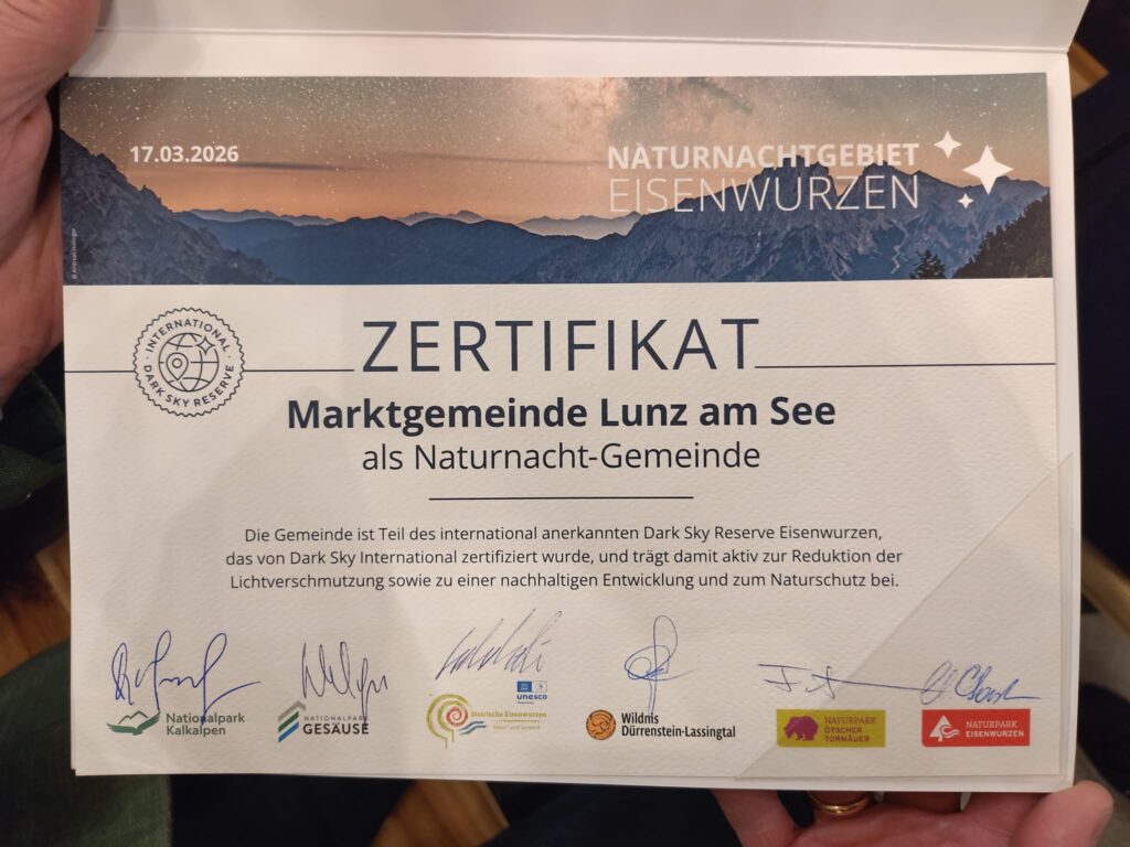 Am 17.03.2026 🌙✨ fand im Nationalpark Pavillon Gstatterboden 🏞️ die offizielle Überreichung desZertifikats 📜 für das Naturnachtgebiet Eisenwurzen statt.