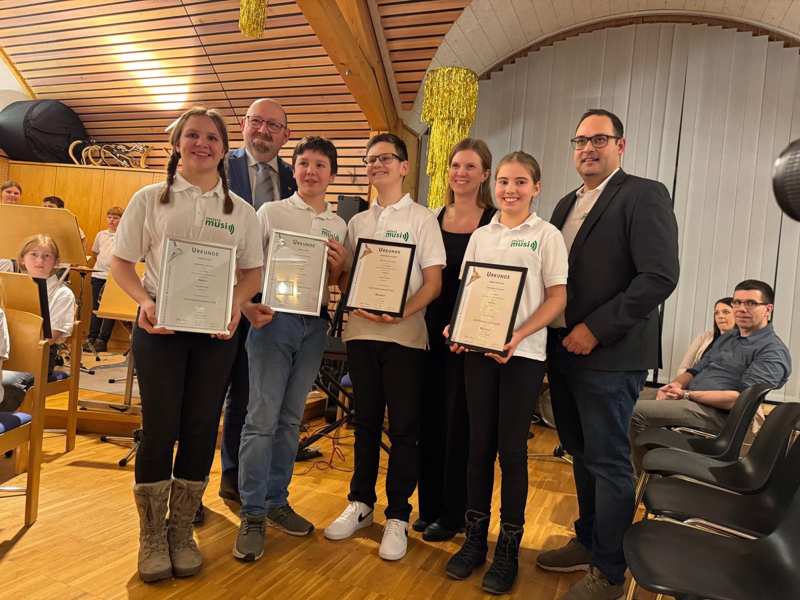 Der Bezirksobmann des Blasmusikverbandes, Werner Pitzl, sowie Kapellmeister Gerold Huber überreichten Leistungsabzeichen an vier engagierte sowie talentierte Nachwuchsmusikerinnen und -musiker: